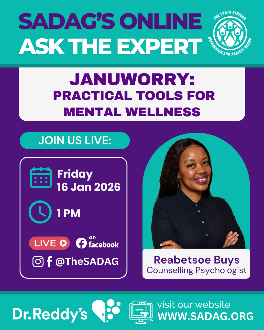 Join SADAG’s upcoming Ask the Expert with Counselling Psychologist Reabetsoe Buys as we unpack practical coping tools for “JanuWorry”. The session takes place on Friday, 16 January 2026 at 1pm and will be streamed live on Facebook @TheSADAG.