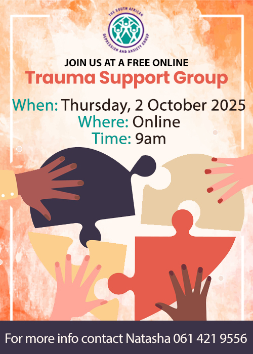 Have you experienced Trauma and are looking for a safe space to talk, share, and heal? Join SADAG’s FREE Online Trauma Support Group on Thursday, 2 October 2025 at 9am. This Group creates a supportive and confidential environment where you can connect with others who understand what it means to go through difficult experiences. Whether you choose to share your story or simply listen, it’s a chance to feel less alone and find strength in community. For more information please contact Natasha on 061