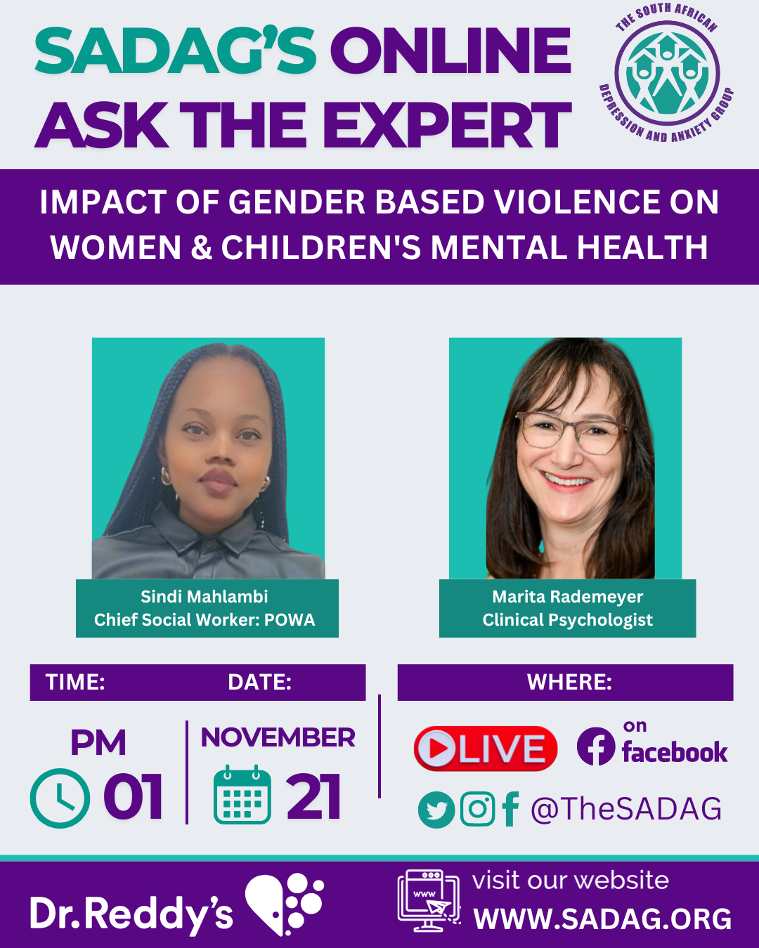 Join Us LIVE on Facebook this Friday, 21 November at 1pm. SADAG’s next Ask the Expert focuses on The Impact of Gender-Based Violence on Women and Children’s Mental Health.
