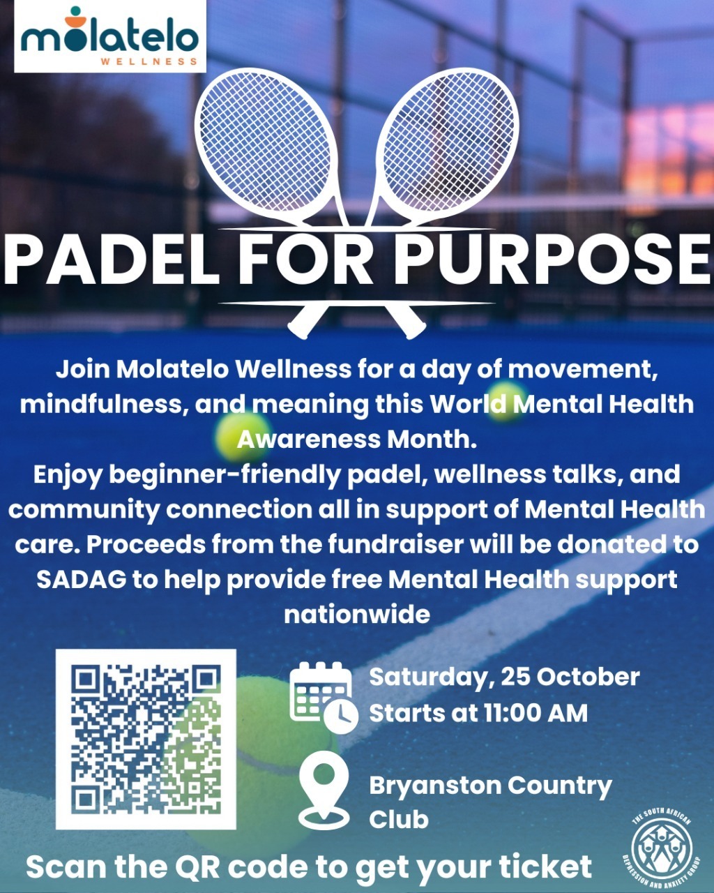 As part of World Mental Health Awareness Month, Molatelo Wellness will be hosting a Padel & Mental Health Awareness Day, which is a fun and inspiring fundraiser taking place on Saturday, 25 October 2025, at The Bryanston Country Club.