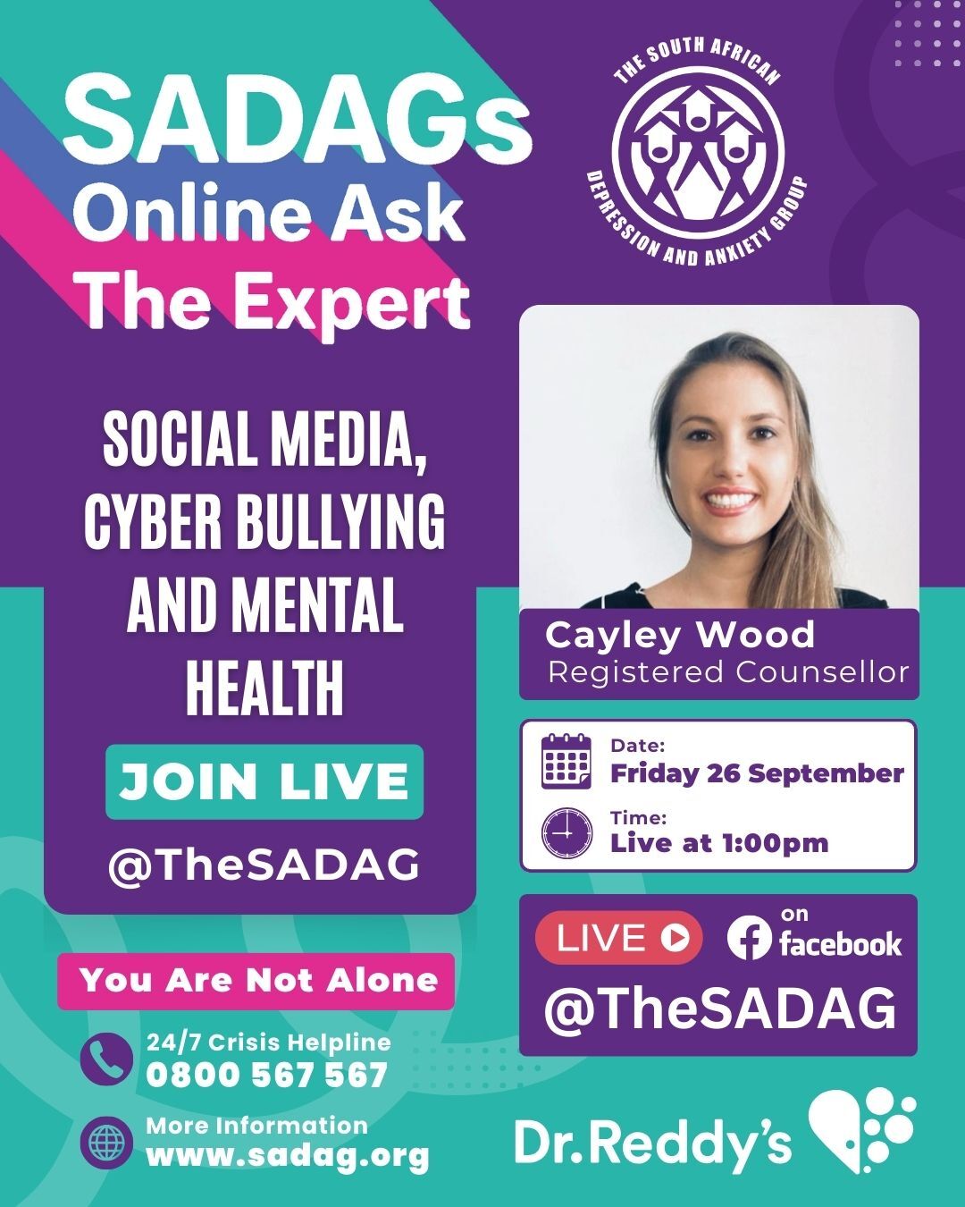Join SADAG this Friday, 26 September at 1pm for an important conversation with Registered Counsellor, Cayley Wood, as we explore the impact of Social Media and Cyberbullying on Mental Health.