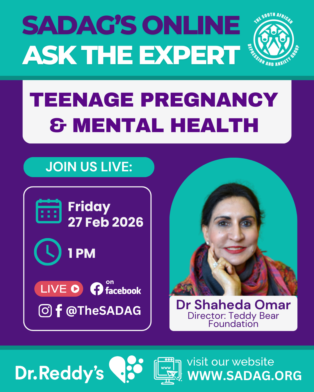 Teen pregnancy can be overwhelming and affect a young mother’s Mental Health. Join SADAG for a Live Online Expert Q&A on Facebook on Friday, 27 February at 1pm with Dr Shaheda Omar, Director of the Teddy Bear Foundation.
