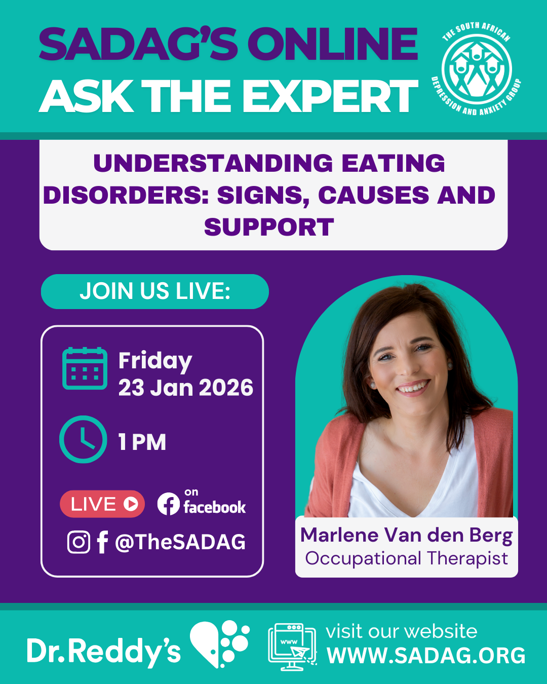 Join SADAG’s Online Ask the Expert session for a powerful and informative conversation that unpacks the signs of Eating Disorders, explores possible causes, and highlights how support and early intervention can make a real difference.